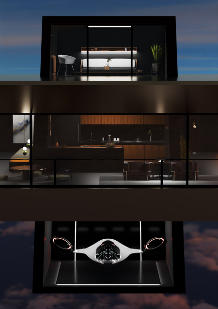На нижнем уровне расположен гараж, в котором хранится личный летательный аппарат