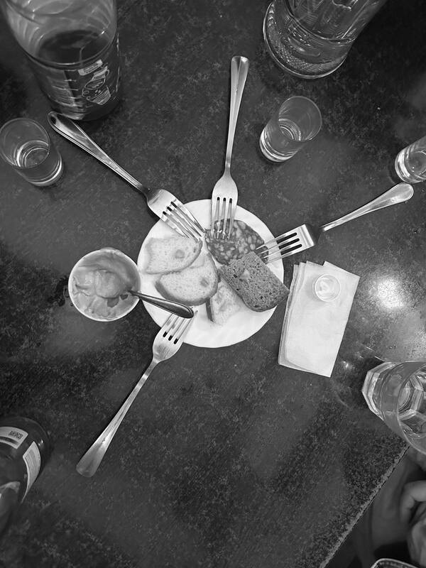 «Зачем нужны ужины в дорогих ресторанах если можно придти в маяк и есть хлеб с хреном?» мне кажется это отличная цитата которая пришла на ум к моему знакомому под конец празднование открытия выставки, куда пришло очень мало людей. Когда люди со стороны слышат слова богема возникает два образа, первый — образ безработного, но очень образованного человека который почему-то постоянно ест в ресторанах и общается с богатыми людьми. Второй же образ относится к более ироничному образу, а именно просто безработному околотворческому человеку. В этом кадре запечатлен образ настоящей петербургской богемы (интеллигенции), а именно встреча в неприметном кафе на Маяковской с бутербродом за 30 рублей, ритуально разложенные вилки на всех кто сидит за столом, но это только в кадре, но кто знает что происходит вне этого пространства.....