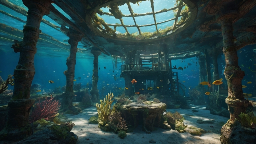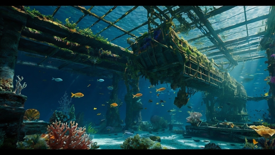 Промт: Create a game location for a cute underwater monster. Location: wreckage of a sunken ship, partially overgrown with coral and algae. The water is clear, with sunlight streaming through the water. Inside the ship are many nooks and caves where the monster can hide and play. Around the ship — swarms of colorful fish. The lighting should emphasize the cute atmosphere. The environment should be safe and inviting to explore. Focus on details: rust, growing coral, plants poking through the boards. The location should be done in a 3d computer graphics style