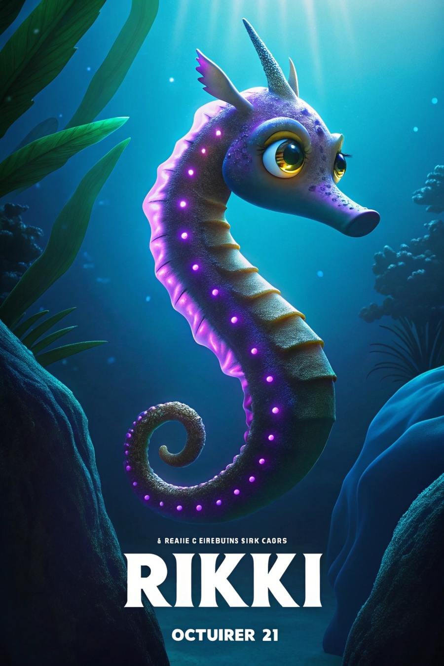 Нейросеть: Recraft Пресет: My custom style Промт: Poster «Rikki» silhouette against the mysterious depths of the sea, with bioluminescent creatures glowing dimly around him. Style: mysterious and adventurous. Color palette: navy blue, purple and glowing green.