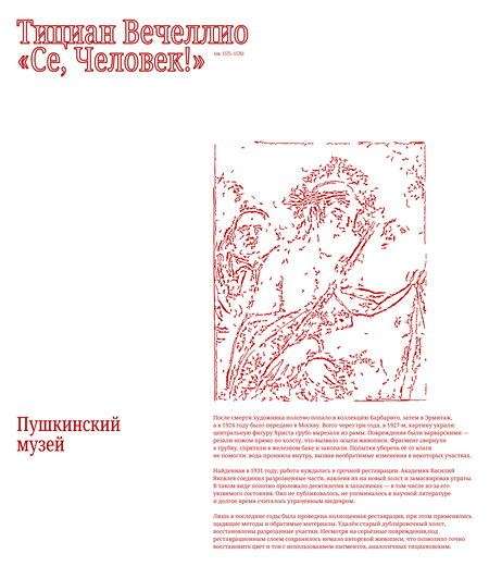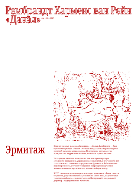 Проект задумывается как стремление к решению двух проблем: 1. Расширить контекст, который известен зрителям о произведениях и музее. Кажется важным и интересным не только показывать людям работы в залах, но и рассказывать их судьбу 2. Проект не только напоминает о хрупкости произведений в коллекциях музеев, но и проводит сравнение с наследием, которое каждый день все больше разрушается и которому не всегда удается помочь — это архитектура, зачастую в регионах, о которой зритель не задумывается из-за того, что не соприкасается с ней. Проект ставит это наследие в ряд с известными шедеврами. Процент от продаж может идти на помощь в консервации и восстановлении архитектур.