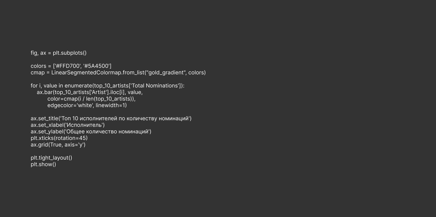 В оформлении графиков я стремилась создать визуальную связь с самой наградой. Вдохновившись цветовой палитрой золотой статуэтки, я использовала градиент оттенков золотого, включив в него коды #FFD700 и #5A4500. Эти цвета были применены ко всем графическим элементам, создавая единый и узнаваемый стиль, ассоциирующийся с престижем и триумфом, присущими премии «Грэмми».