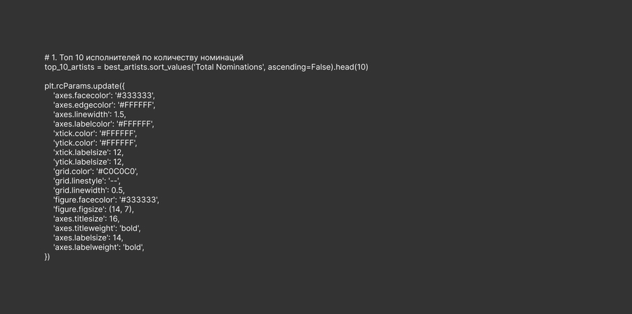 Код для столбчатой диаграммы «Топ 10 исполнителей по количеству номинаций».