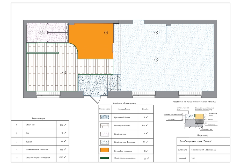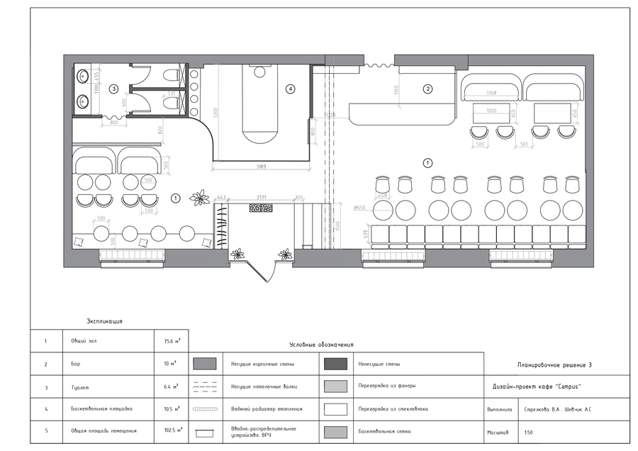 Основная идея проекта — создать уютное, светлое, красивое место, где гости могут насладиться вкусной кухней и молодежной атмосферой. В нашем кафе мы расположили баскетбольную площадку, которая позволяет еще и активно провести время!