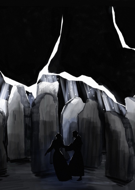 Финал в произведении открытый, я хочу верить в возможность исцеления человеческой души, в свободу, которую способна подарить любовь. В моей сценографии Дон Гуан освобождается от тяжести каменных массивов, разбивая стену, которая заключила его в камерный мир сознания. Для последней сцены, я решила использовать прием расширения пространства, сцены проходившие до этого в «пещерной» замкнутости, сменяются светлой, чистой, пустотой. Когда задник открывается, зрители видят пространство сцены, озаренное белым светом, чувствуют ветер, дующий на них. И наконец, могут сделать глубокий, свободный вдох. Гуан не избежал наказания или смерти, понимание этого остается на зрителях. Он лишь разрушил внутренние окаменелости и острые грани, благодаря любви.