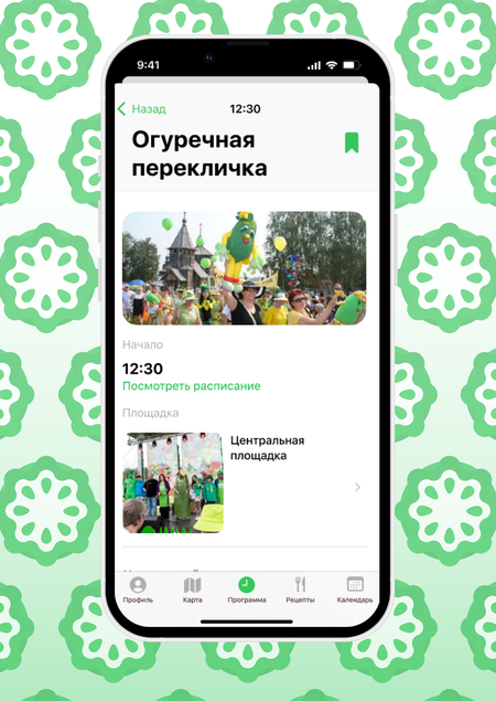 Приложение для гостей «Дня огурца» в Суздале. С помощью приложения можно приобрести билеты на фестиваль, узнать расписание праздника и найти нужное мероприятие на карте. Также с помощью приложения можно узнать рецепты блюд из огурцов и получить информацию, как правильно ухаживать за огуречной рассадой.