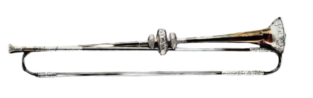 Серебряная труба Булла и Дадли, ок. 1680 г., Английская школа (XVII век). Музей Лондона (слева). Натуральная труба в ми-бемоль. Андреас Наеплаеснигг. 1790 г. Латунь, цветной камень (справа)