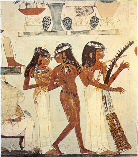 Три музыкантши. Рисунок из гробницы Нахта. Ок. 1422—1411 гг. до н. э. (слева) Лютня. 200-500 гг. Дерево со следами краски (справа)