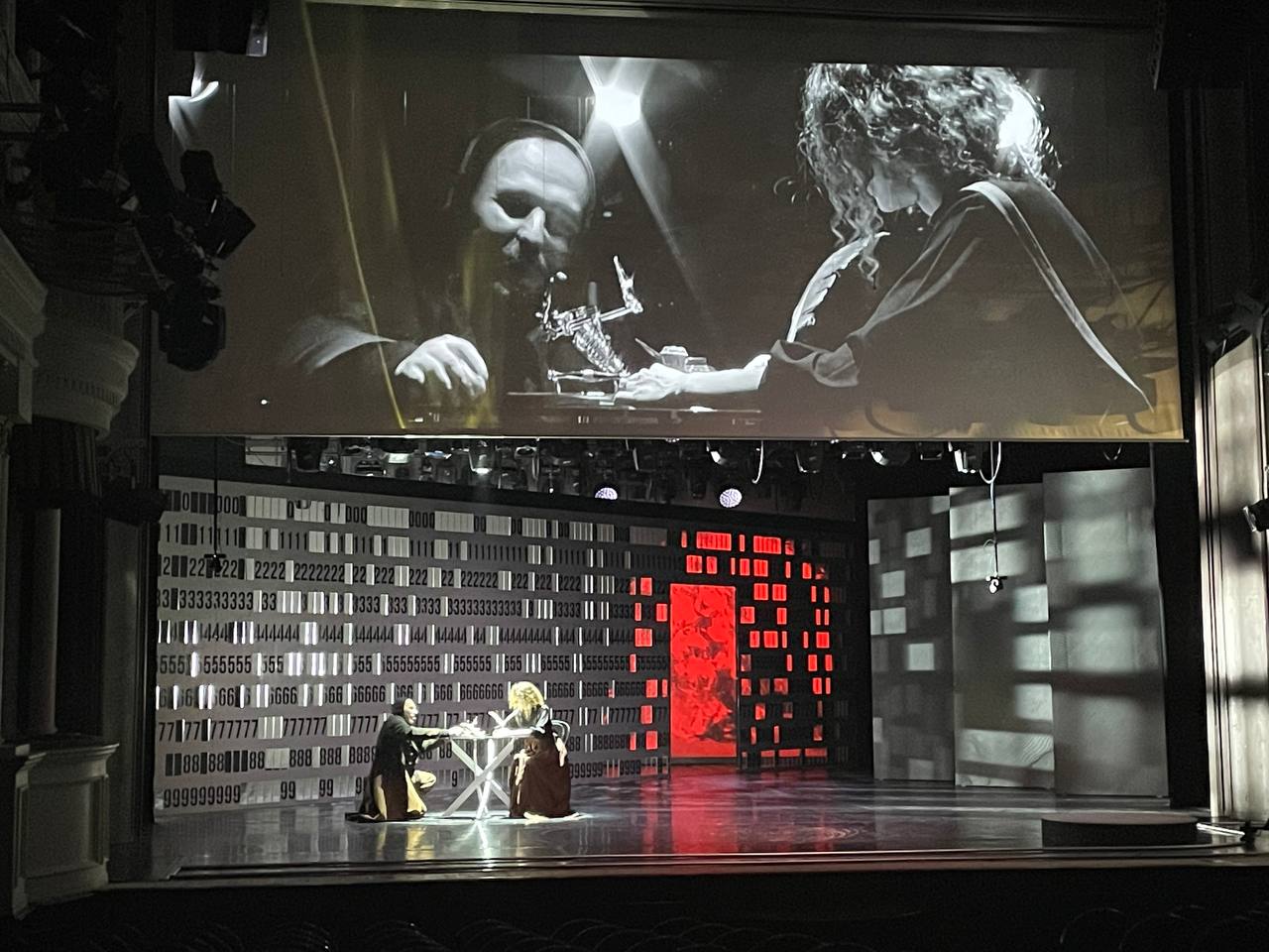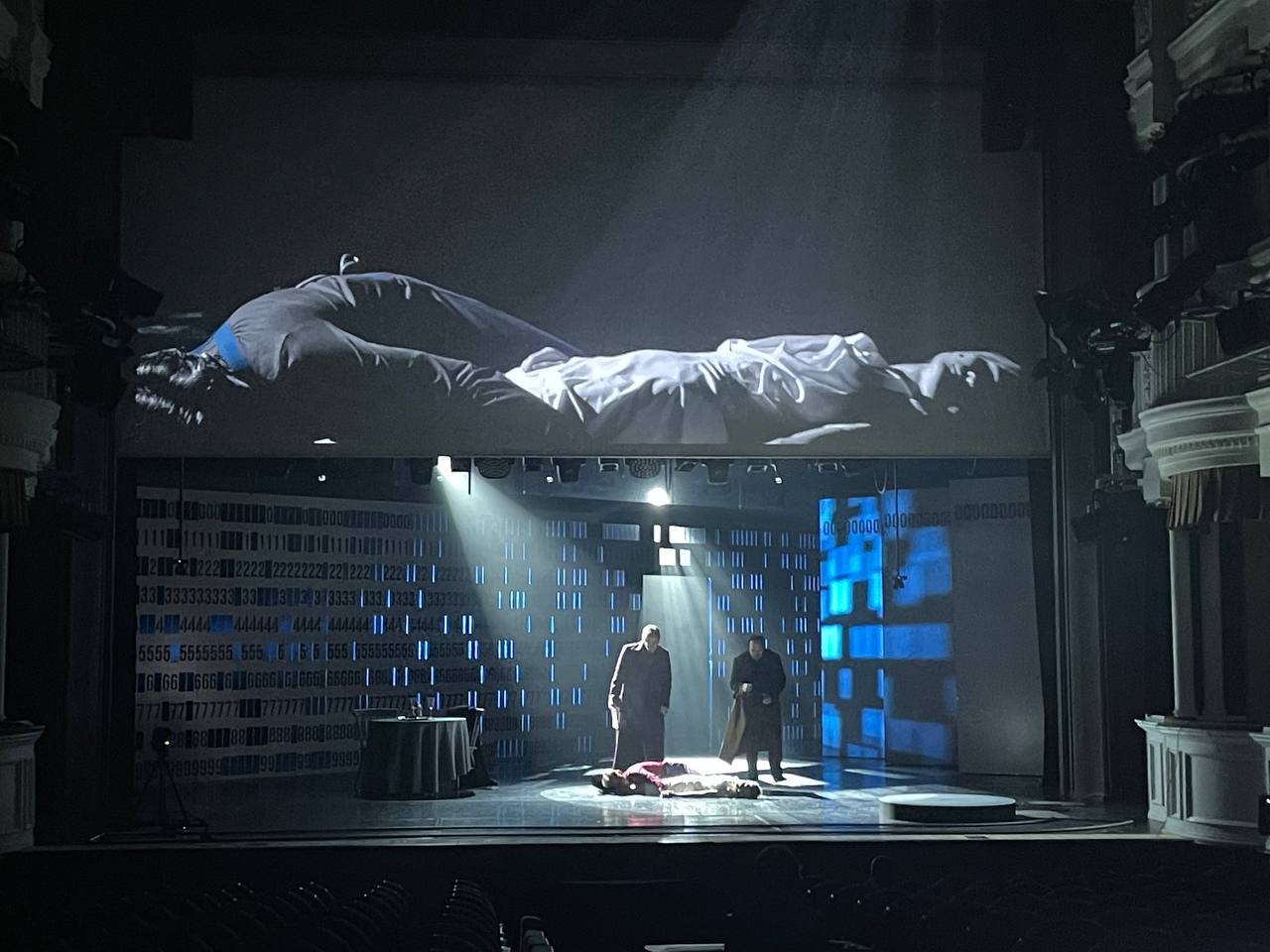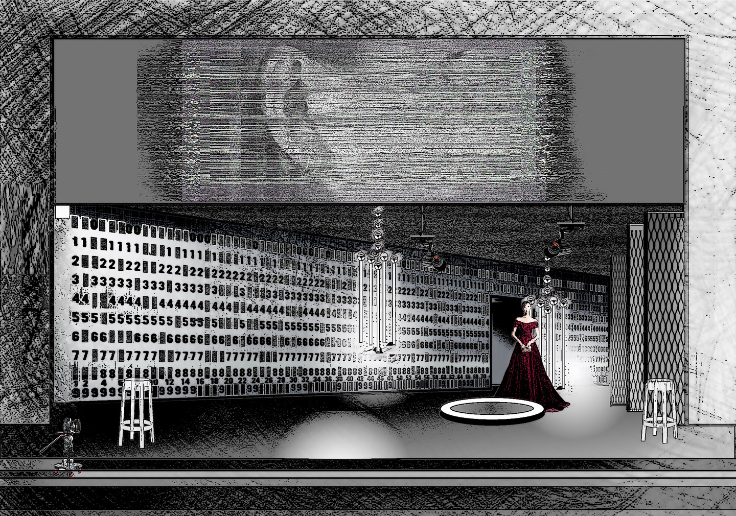 Идея сценографии создать цифровое пространство вокруг живых чувств героев пьесы. Главным элементом декорации стала 15 метровая перфокарта выполненная из металлического листа. Также в спектакле важный элемент играют камеры наблюдения. Сигнал с этих камер укрупняет человеческие эмоции на глазах изумленной публики. Фотография спектакля взята с сайта театра Пушкина. г. Красноярск.