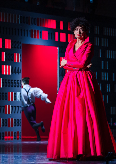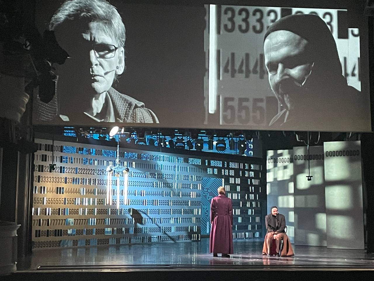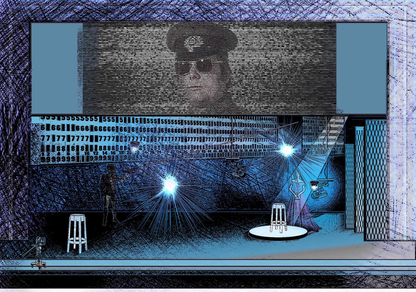Идея сценографии создать цифровое пространство вокруг живых чувств героев пьесы. Главным элементом декорации стала 15 метровая перфокарта выполненная из металлического листа. Также в спектакле важный элемент играют камеры наблюдения. Сигнал с этих камер укрупняет человеческие эмоции на глазах изумленной публики. Фотография спектакля взята с сайта театра Пушкина. г. Красноярск.