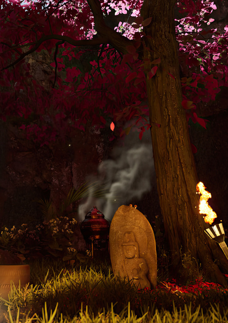 Общая идея: Центральным элементом сцены является дерево сакуры, растущее в глубине таинственной пещеры. Прямо на дерево из трещины в потолке пещеры падают мягкие солнечные лучи, создавая атмосферу, контрастирующую с тенью, царящей в окружающем пространстве. Вокруг дерева плещется спокойное море, что создаёт ощущение уединения и умиротвторения.