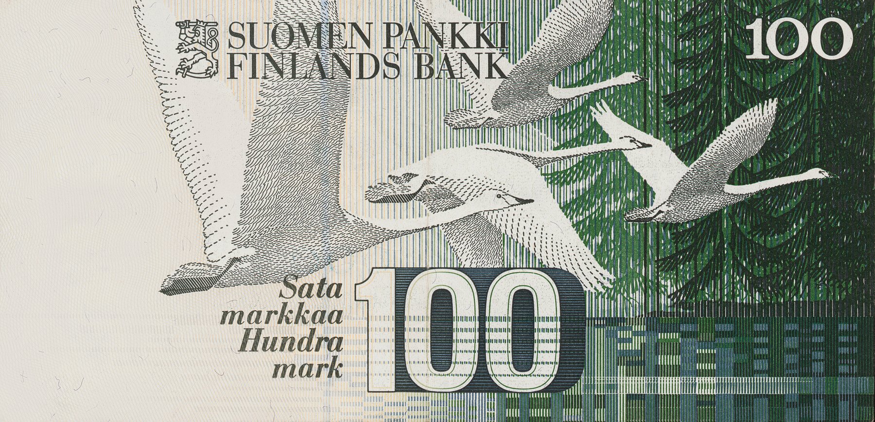 Купюра в 100 марок выпускалась Банком Финляндии с 1986 по 1993 годы. На лицевой стороне размещён портрет великого финского композитора Яна Сибелиуса. На оборотной стороне находится графическое изображение лебедей-кликунов, летящих над озером, отсылающее к симфонической поэме Сибелиуса «Туонельский лебедь» (1893).