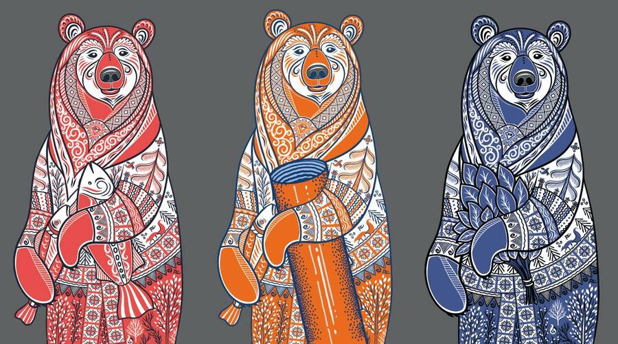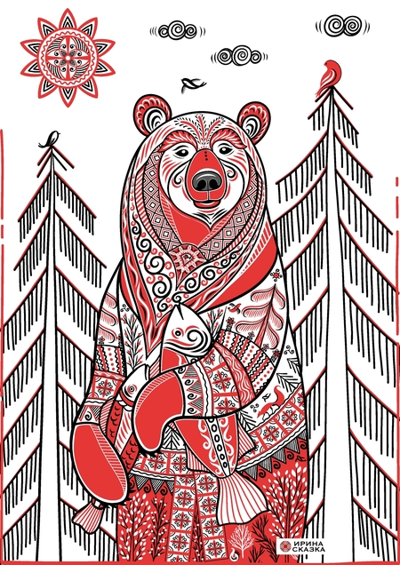 Иллюстрация Медведя с рыбой с использованием мезенских мотивов.