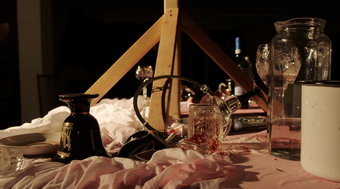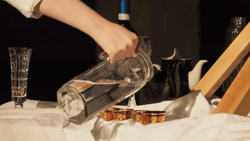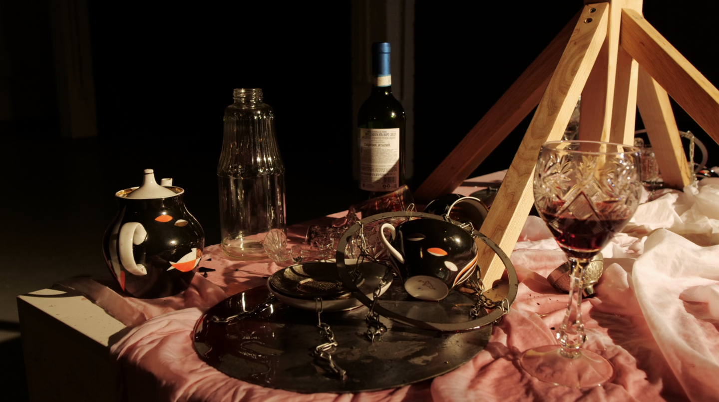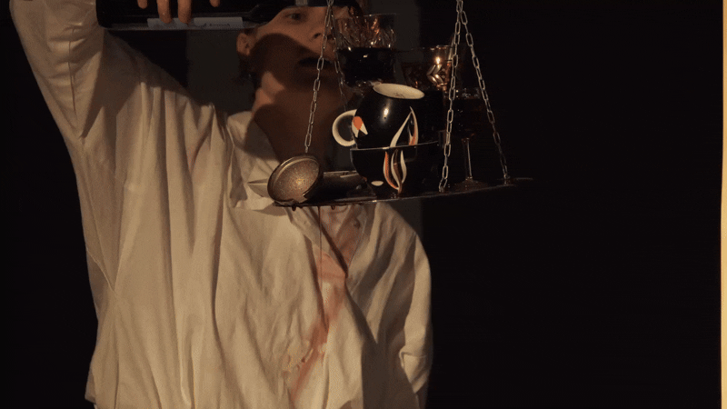 Герой молча подходит к столу. Он начинает переливает содержимое сосудов, экспериментирует с расположением, пьет из бокалов, чтобы облегчить чаши весов. Действия становятся хаотичными. Опьянение мешает контролю, движения становятся абсурдными. Весы перевешивают — сосуды падают и разбиваются, стекло разлетается, вино окрашивает скатерть и одежду. Герой молча уходит.