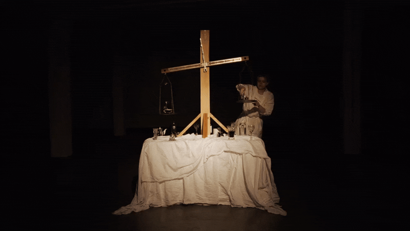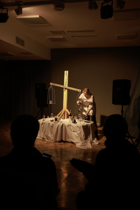 В серии своих перформансов я исследую сложный и многогранный процесс поиска баланса в жизни — в любви, работе, финансах и удовольствиях, таких как, например, алкоголь. На сцене расположены большие весы, символизирующие равновесие, к которому мы все так стремимся.