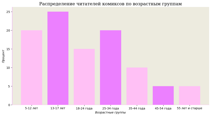 В данном фрагменте мы можем рассмотреть какой возраст больше предпочитает читать комиксы. Чаще всего это 13-17 лет, то есть подростки. В этом возрасте у комиксов обычно самый пик популярности. Потому что мы растём и начинаем смотреть на тех персонажей, на которых хотим быть похожими.
