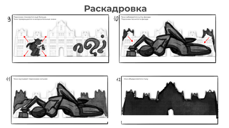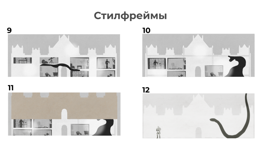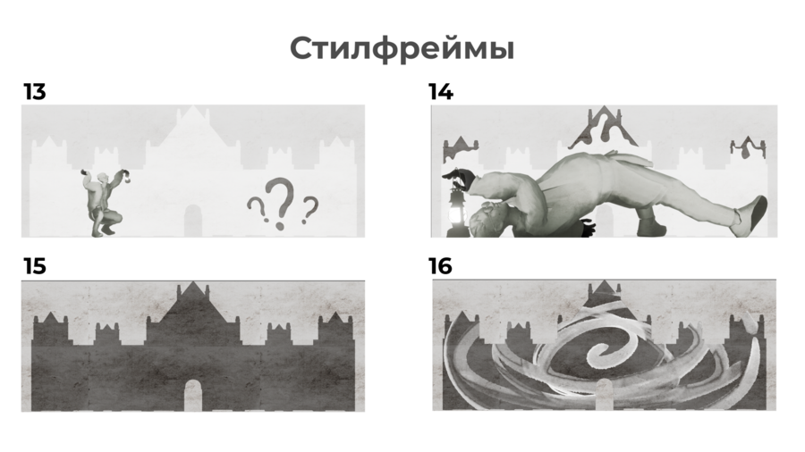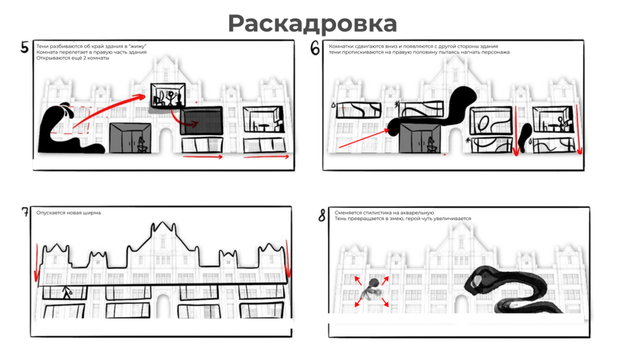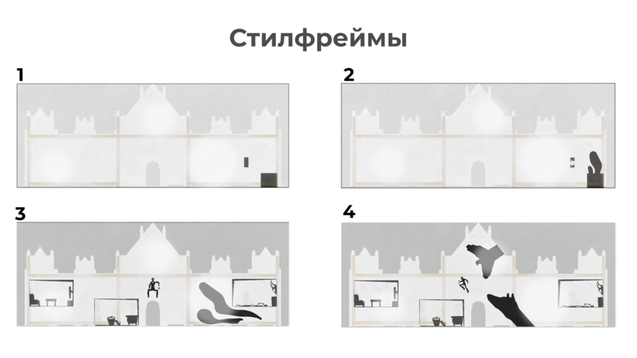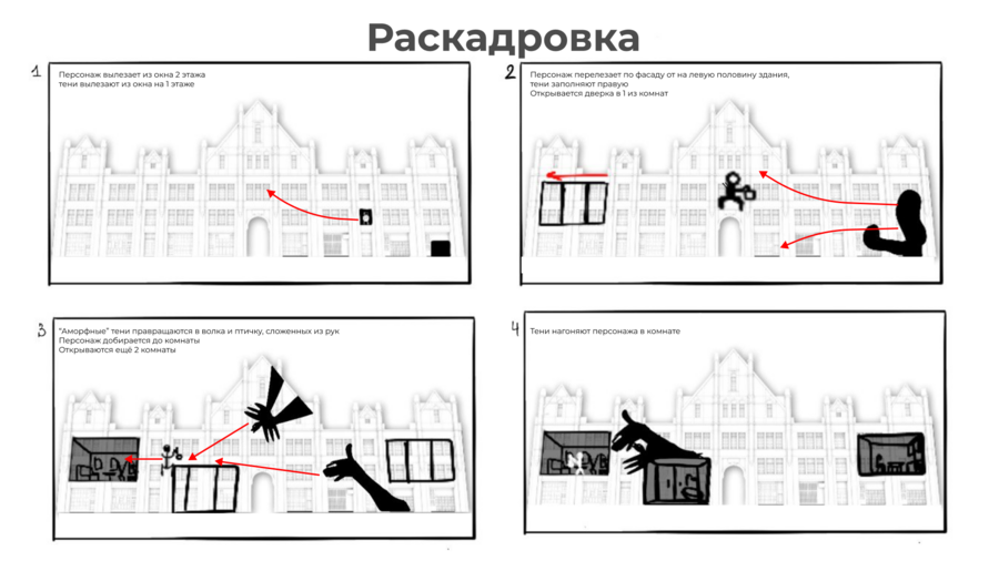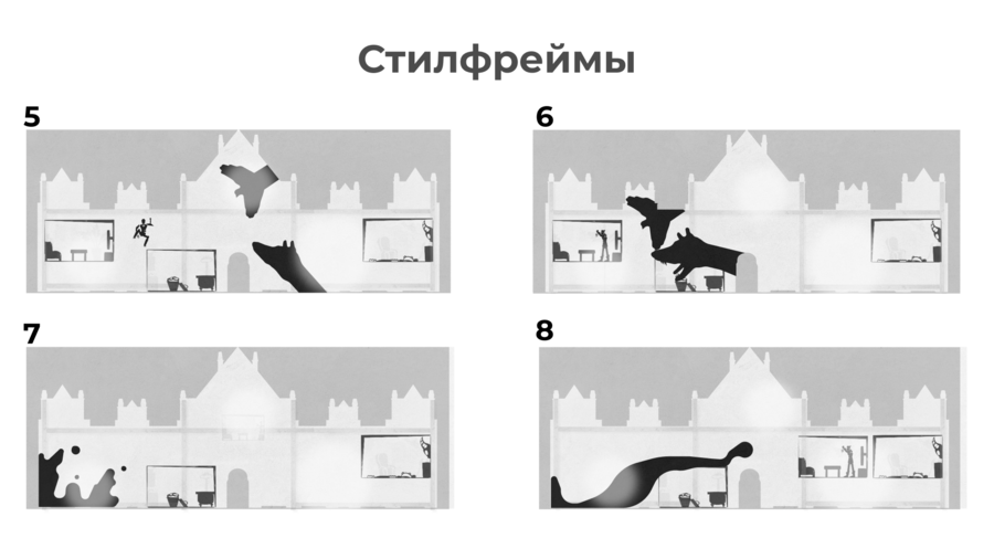 1 АКТ: «Фаза быстрого сна» Нам снится тревожный сон, герой не понимает что происходит, он лишь судорожно движется вперед, прочь от тревожащих его жутких образов. Визуал стилизован под театр теней.