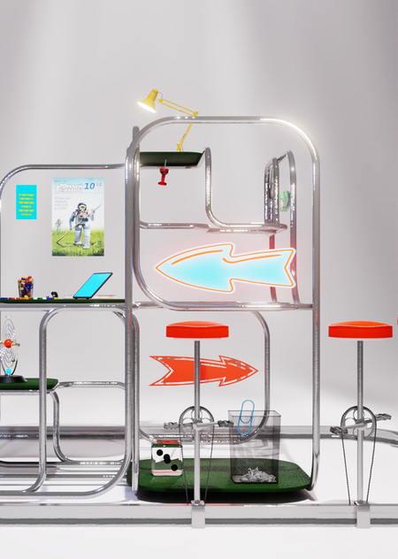 Стенд для профориентационного образовательно-туристического проекта «Город открытий» — интерактивный элемент, напоминающий рельсы московского метро. Стенд состоит из универсальных модулей, которые могут трансформироваться под разные площади. Он одновременно напоминает монорельс, школьные парты и шкаф. Бесконечный путь по кругу символизирует непрерывное движение в городе. Посетители могут сесть на стулья-вагонетки, крутить педали и ездить вокруг образовательного стенда, получая интерактивный опыт. Во время движения можно взять с полки любой предмет, изучить его и поставить на место.