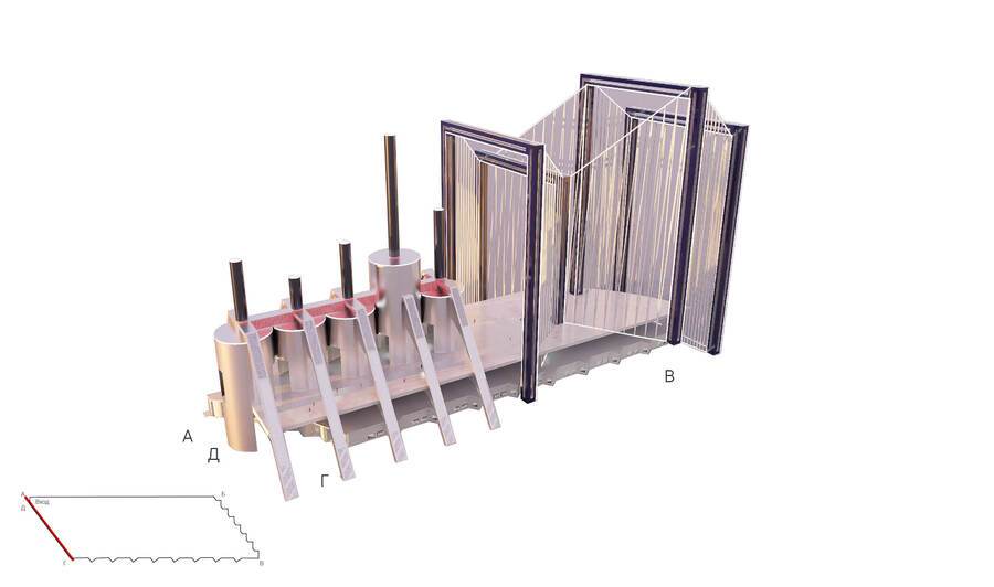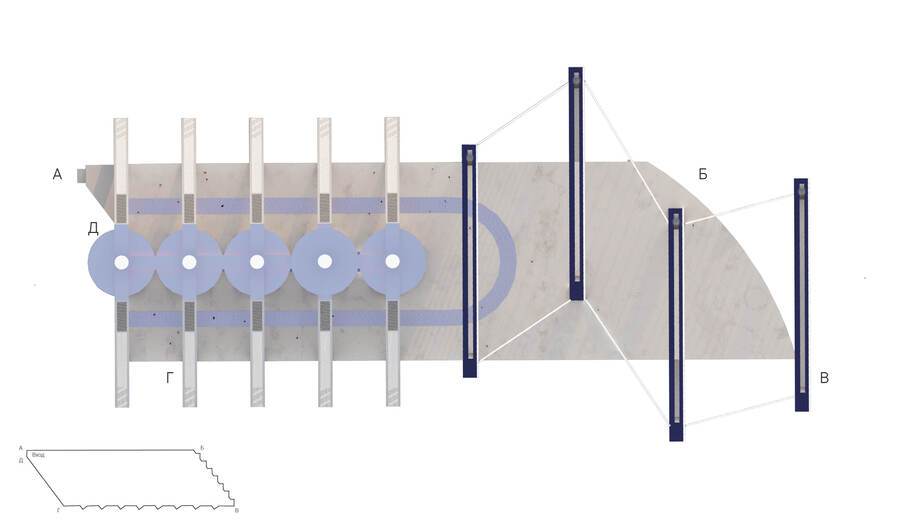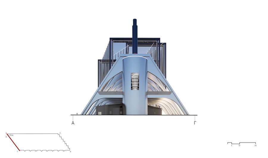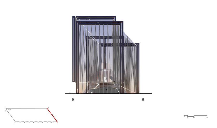 Композиция отсылает к принципам готической архитектуры: вертикальные элементы формируют устремлённость вверх, а наклонные опоры интерпретируются как современные контрфорсы, перераспределяющие нагрузки и одновременно направляющие движение пространства. Подобно готическим соборам, фасад не замыкает объём, а раскрывает его в сторону бесконечности.
