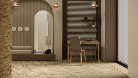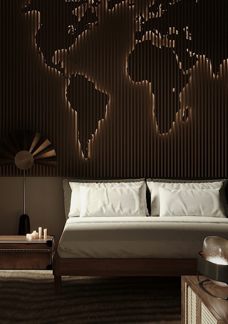 Интерьер вдохновлен духом приключений и таинственности. Активно применяются дерево, камень, хлопок и другие материалы, отсылающие к египетской природе и археологическим экспедициям. Преобладают приглушенные оттенки песка, охры, темно-зеленого, с акцентами золотого и латунного цвета. Царит атмосфера сдержанной элегантности и функциональности. В интерьере присутствуют фрагменты карт, артефакты.