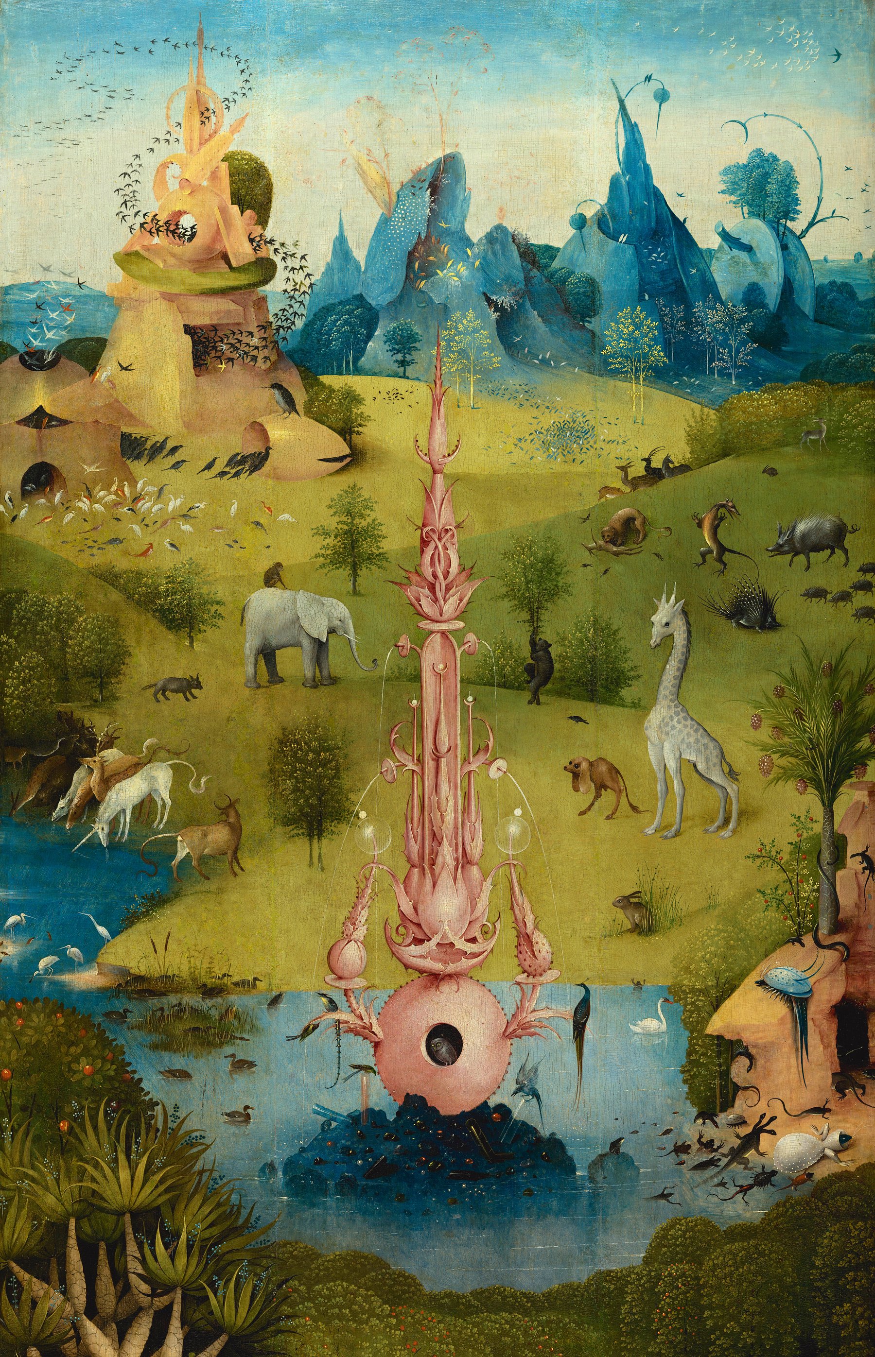 Иероним Босх, один из самых загадочных мастеров Северного Возрождения, создал триптих «Сад земных наслаждений» около 1490–1500 годов. Левая часть композиции, изображающая Рай, представляет собой сложную аллегорию третьего дня Творения. Полотно представляет перед нами фантастический пейзаж с причудливыми формами, напоминающими то ли сказочные скалы, то ли архитектурные сооружения. В центре композиции расположен таинственный «Источник жизни» — розовая структура, утопленная в лазурной воде и окруженная экзотическими животными, среди которых можно увидеть единорога, трехглавых птиц и других гибридных существ. Босх работает в характерной манере, сочетающей тончайшую проработку деталей с общей ирреальностью изображения.