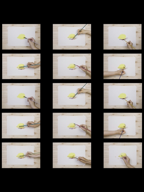 此创作基于“镜像”并且针对教育教学的主题,以“学生作为老师的镜像”展开。该视频是由作者拍摄的81张手绘照片做成的可循环播放定格动画影像,并且后续进行了复制与再复制。9个不同的人,使用不同的画笔,通过9个分镜完成,画出来的梨是一样的。作者以极端的视觉表现手法,去批判当下众多培训机构“有教无育”的模版化教学。而学生盲目听从“你像我这样画才能得高分”的诱导,使这样的教学进入一个“请你像我这样做,我就像你这样做”的无限复制。