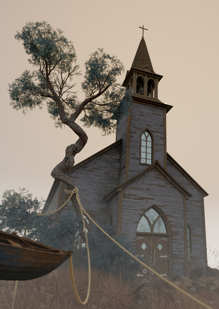В центре сцены — церковь. Простая, без лишнего, она будто выросла из самой тишины. Это не место силы, а скорее место покоя — точка, где всё внутри становится ясным.