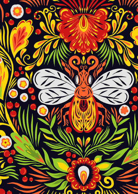 Серия иллюстраций вдохновленная русскими узорами: Гжель, Хохлома, Городецкая и Мезенская росписи. Авторская задумка заключается в сочетании этих стилей с образами насекомых. Каждый образ адаптирован под стилистику и органично вписан в окружение. Данная графическая серия может использоваться в качестве иллюстраций для календаря или других носителей, таких как открытки, сумки, футболки или вазы.