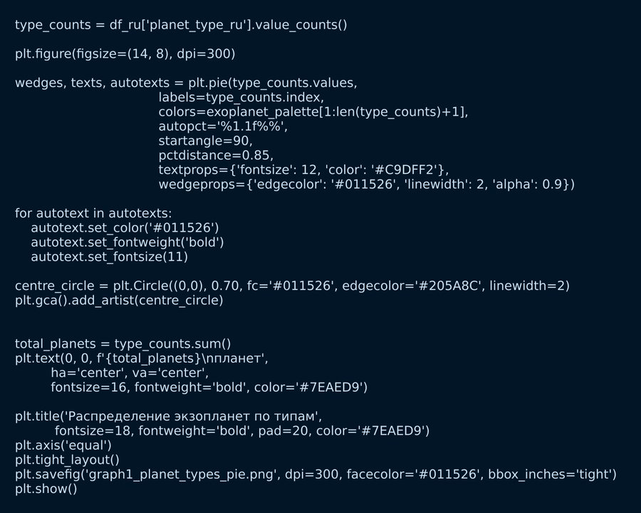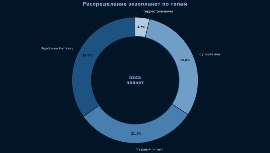 Круговая диаграмма показывает, какие типы обнаруживали чаще всего. Большинство открытых планет — газовые гиганты, похожие на Юпитер или Сатурн. Но это связано не с тем, что их больше во Вселенной, а с тем, что большие планеты проще обнаружить современными методами. Суперземли и землеподобные планеты составляют меньшую долю, но их количество продолжает расти с развитием технологий.