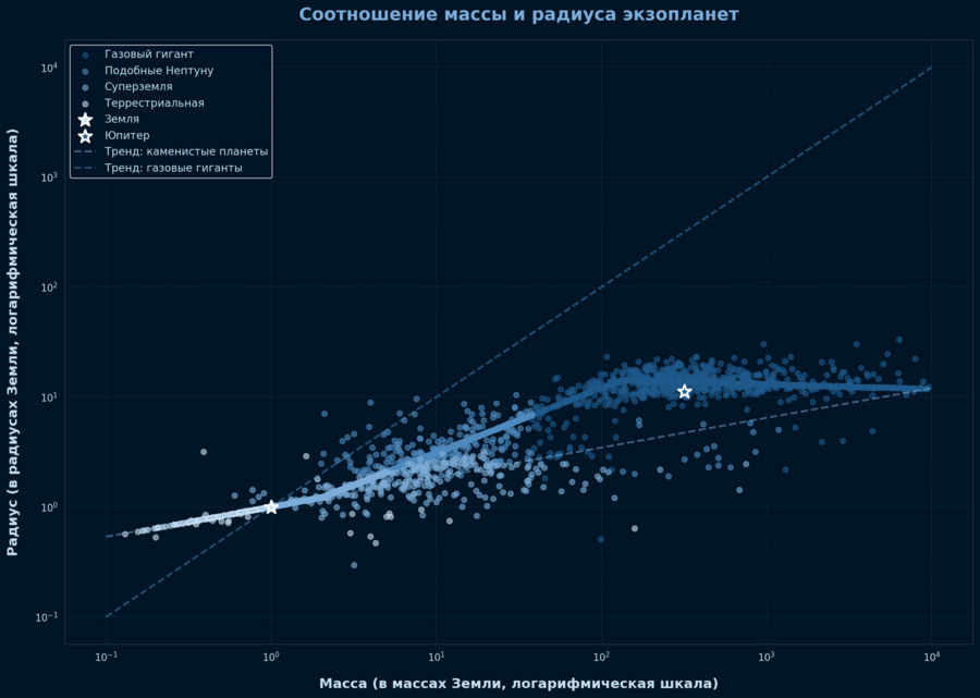 График рассеяния показывает фундаментальное различие между типами планет. Каменистые планеты (слева внизу) следуют одной зависимости массы и радиуса, в то время как газовые гиганты (справа вверху) — другой. Земля и Юпитер отмечены как реперные точки. Видно, что большинство обнаруженных планет — это либо суперземли (в 2-10 раз больше Земли), либо горячие юпитеры. Планет размером точно с Землю пока найдено мало — их сложнее обнаружить.