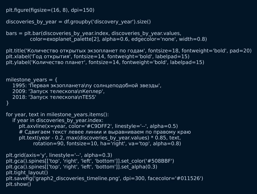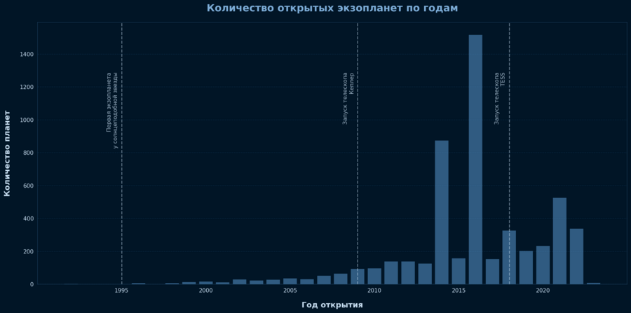 На этом графике виден экспоненциальный рост открытий экзопланет. Особенно резкий скачок произошел после запуска космического телескопа Кеплер в 2009 году. Каждый пик на графике соответствует новым технологиям или миссиям.