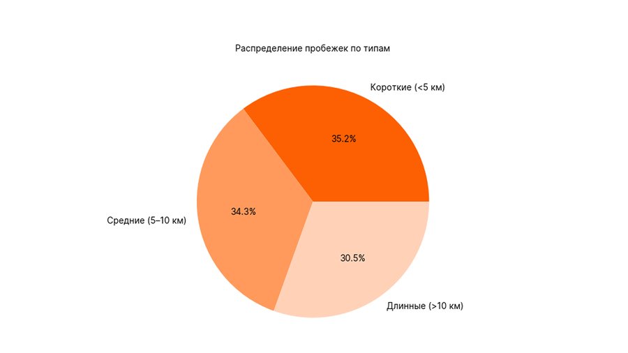 Диаграмма показывает, какая доля всех тренировок приходится на короткие, средние и длинные дистанции (35.2%, 34,3%, 30,5%). ​Она полезна тем, что позволяет быстро оценить баланс нагрузок: видно, что тренировки распределены довольно равномерно между типами, а значит программа не перегружена только длинными или только короткими забегами.