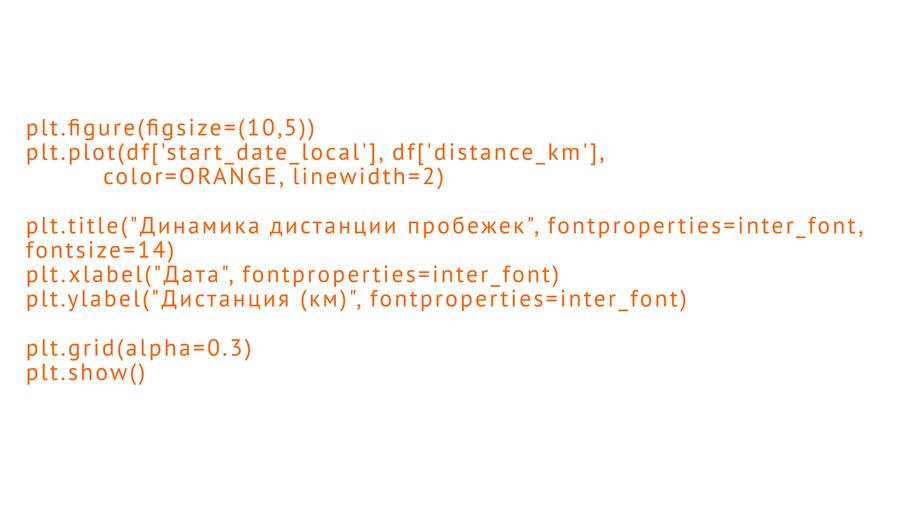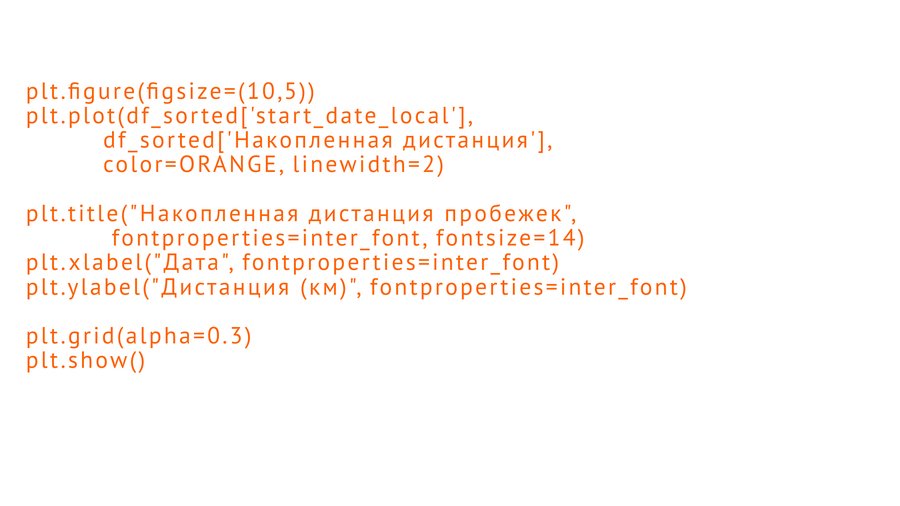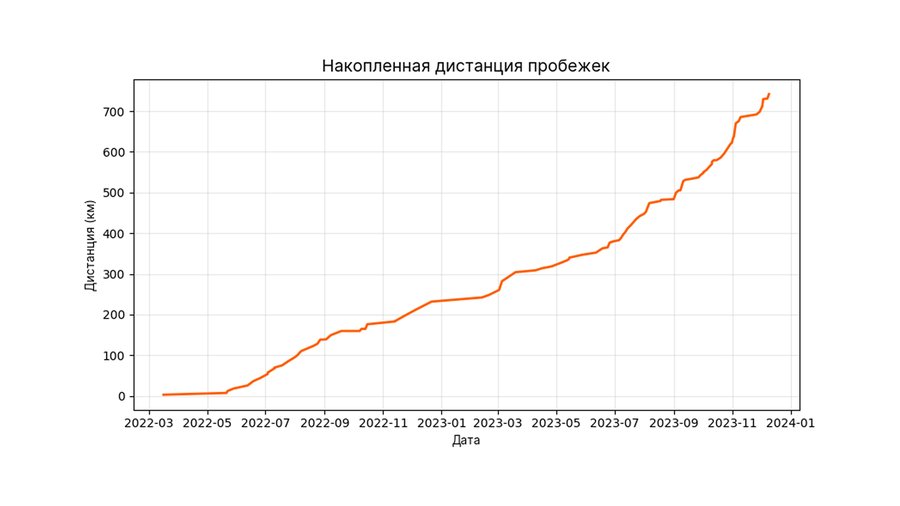 1. Линейный график накопленной дистанции — чтобы показать общий прогресс и рост общего километража во времени. ​Линейный график динамики дистанции — чтобы увидеть колебания длины отдельных пробежек, периоды пиков и спадов нагрузки.