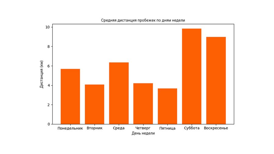 Диаграмма демонстрирует различия в средней дистанции пробежек в зависимости от дня недели, что позволяет выявить поведенческие паттерны тренировок.