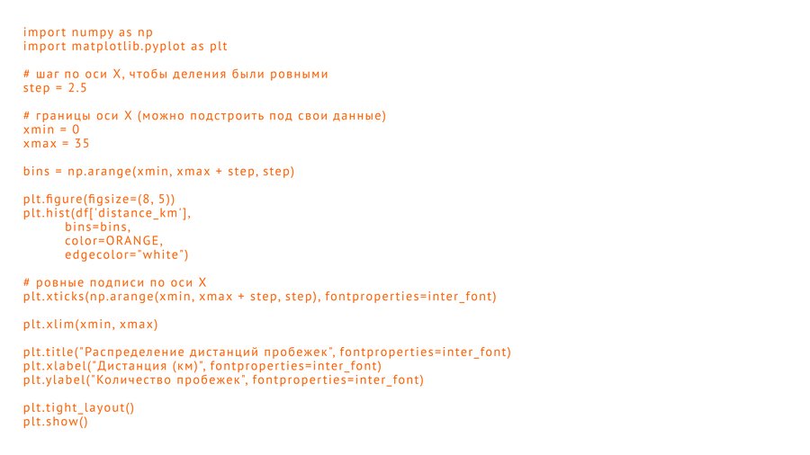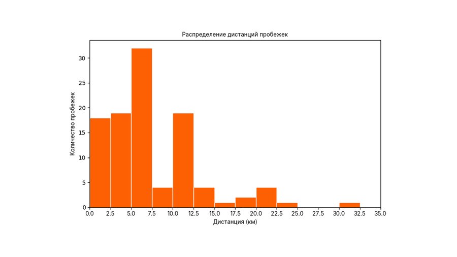 4. Гистограмма дистанций — чтобы понять, какие расстояния встречаются чаще всего и какая дистанция является типичной для пробежки.