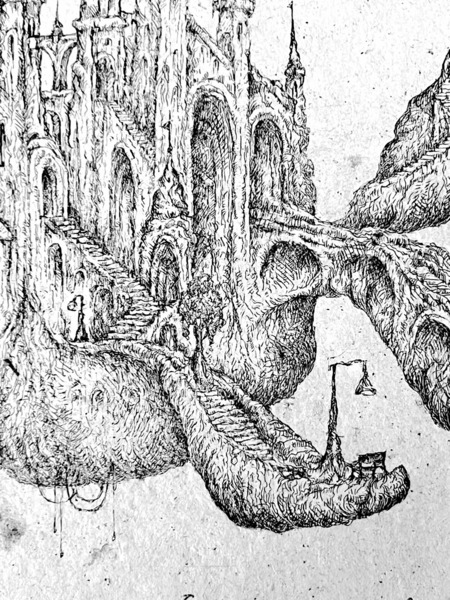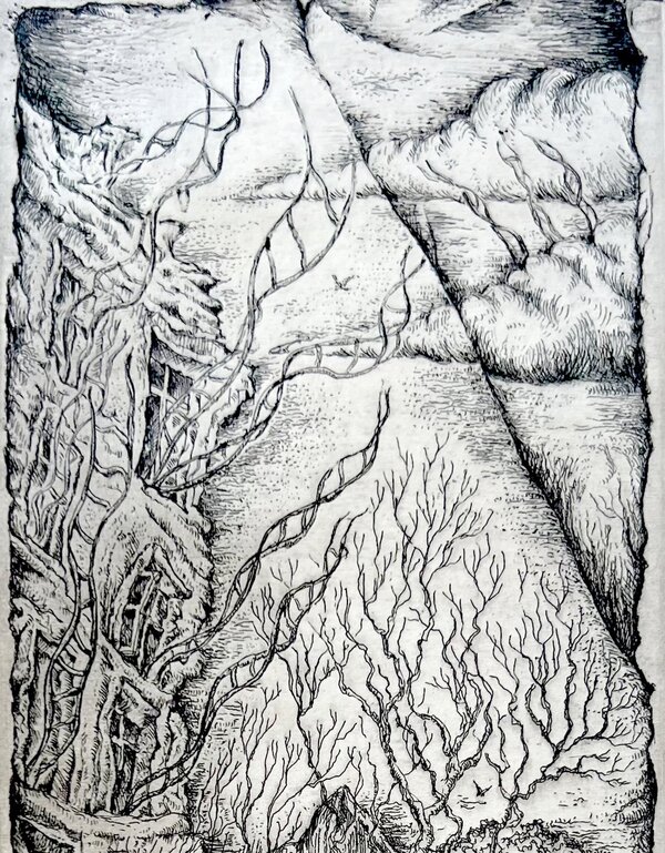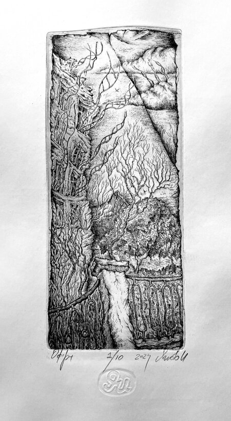 «Лестницы в небо» Офорт, травленый штрих, 2024 8×18 см