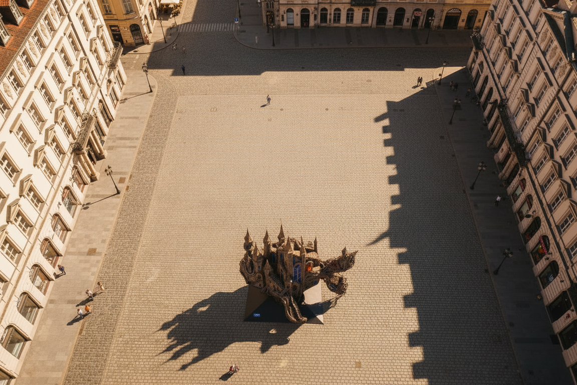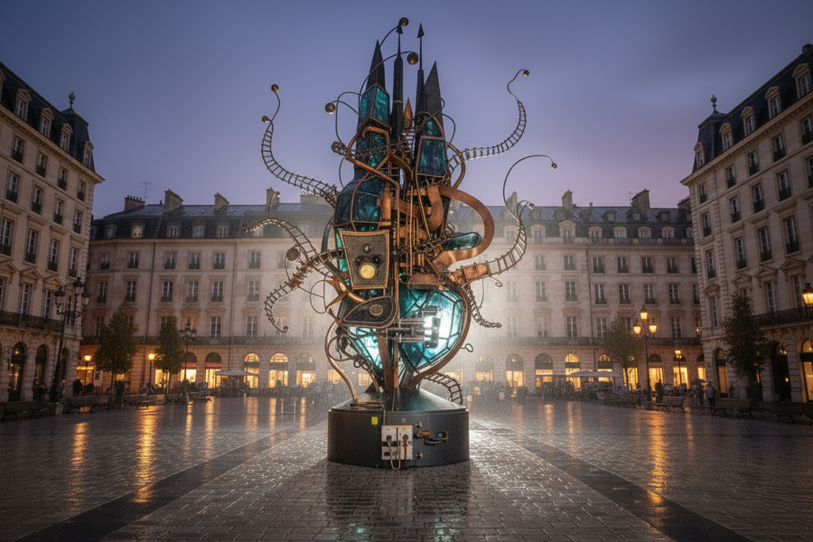За основу проекта были взяты пять небольших офортов не связанных общей темой или серией. Эти работы, выполненные в характерной авторской манере, стали исходными изображениями для нейросетевой интерпретации и последующей трансформации в пять скульптурных арт-объектов расположенных на центральных площадях городов мира.