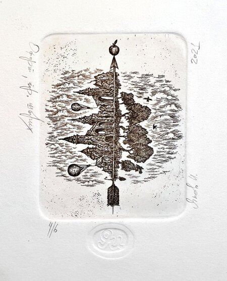«Стрела» Офорт, травленый штрих, 2021 8×9 см