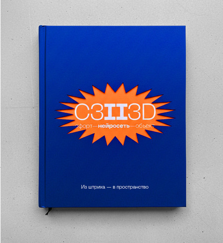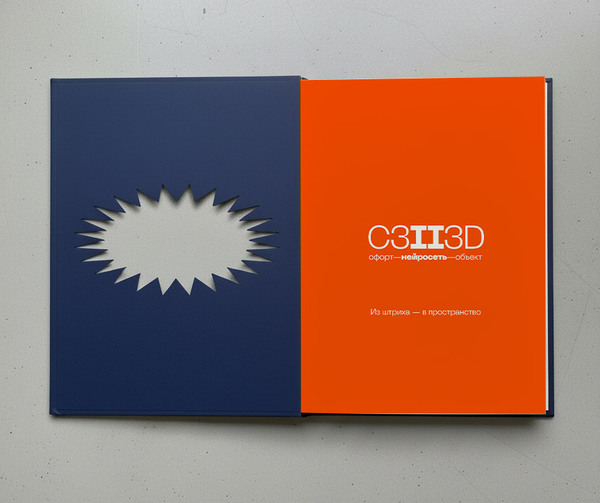 цвет: Синий цвет символизирует цифровую среду, виртуальное пространство, в котором «рождаются» новые формы. Оранжевый — цвет энергии, творческого импульса. Сочетание оттенков синего и насыщенного оранжевого — визуальное выражение диалога противоположностей: традиция ↔ инновация плоскость ↔ объём