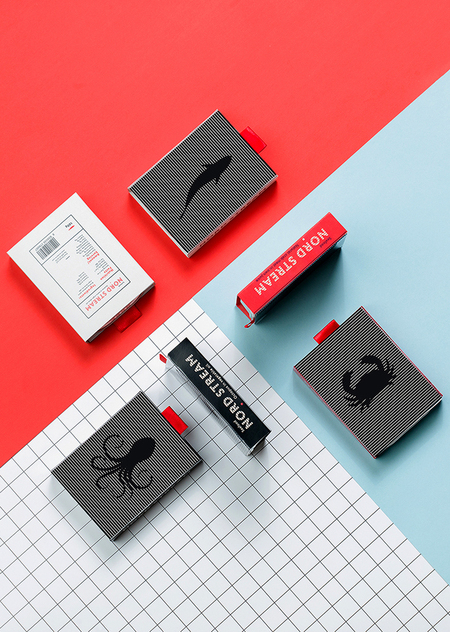 NORD STREAM — серия консервированных изделий. Бренд представлен линейкой из пяти видов морепродуктов: сардины, копченые мидии, краб, осьминог и кальмар. Основные конкурентные преимущества — это интерактивность и отзывчивость. Каждый вид упаковки имеет свою графическую и цветовую идентификацию. Разрабатывая дизайн-концепцию, мы разделяли идею упаковки, которая взаимодействует с потребителем за счет скрытой анимации. Сама анимация основана на принципе работы муарового узора. Анимация, расположенная на вкладыше, начинает двигаться, в процессе открывания упаковки. Это производит яркое впечатление и вовлекает вас в интерактивный процесс.