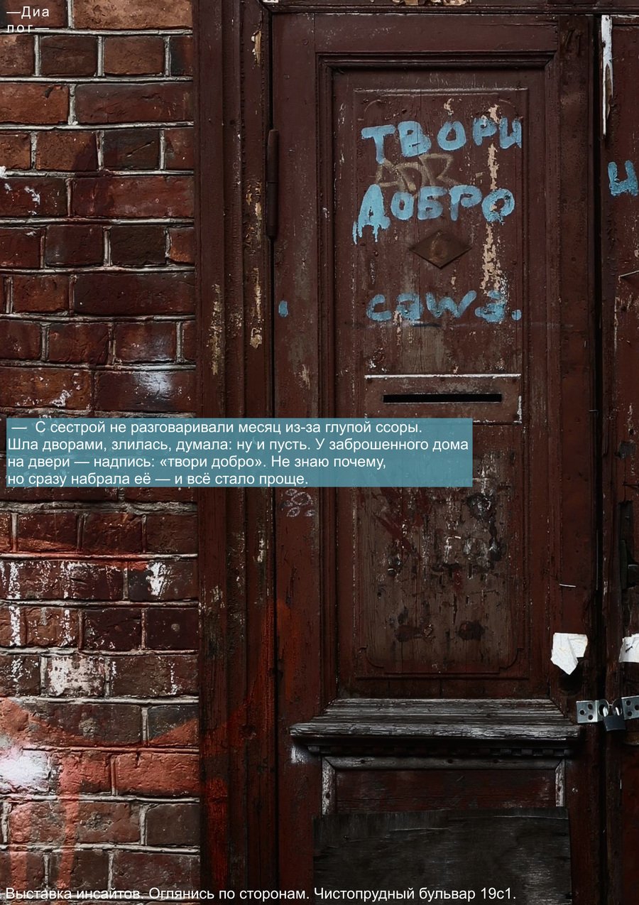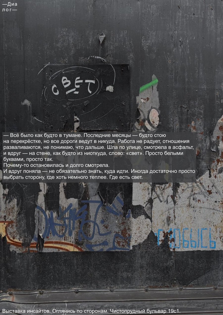 В жизни каждого человека происходят сложные ситуации, где нужно принять определённое решение. Люди не всегда могут предсказать ход и развитие событий, но есть то, что называют «знаками». У каждого свой собеседник. Выставка фотографий о том, что жизнь даёт подсказки, ведёт с нами разговор, обычно они неприметны и абстрактны, не сразу можно их заметить и понять к чему это.