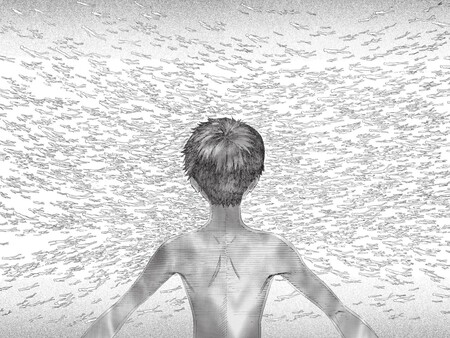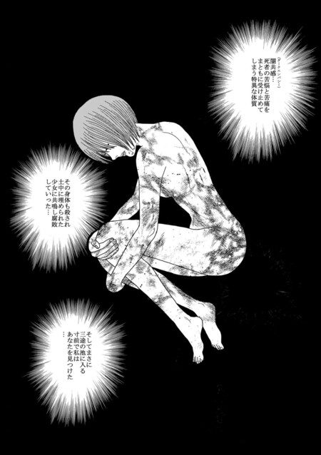 Через визуальные маркеры — надрыв линии, разрушение формы кадра, нарушение линейной перспективы, — мангака инициирует у читателя резонанс с внутренним миром персонажа. Герой, переживая эмоциональное разрушение, проходит метафизическую трансформацию: личность теряет границы, сливается с фоном или напротив — исчезает в пустоте. Читатель, воспринимающий это изображение, переживает очищение через сопереживание, что и является сутью катарсиса. В кульминационный момент мангака предлагает читателю испытать катарсис благодаря визуальным приёмам — не через текст, а через форму, пространство, линии и их отсутствие. Так достигается глубокое эмоциональное потрясение, которое не только усиливает повествование, но и превращает акт чтения в перформативное соучастие. Читатель не просто наблюдает за страданиями героя — он чувствует их кожей, через пустоту между панелями, через визуальное молчание и разрушение образа.