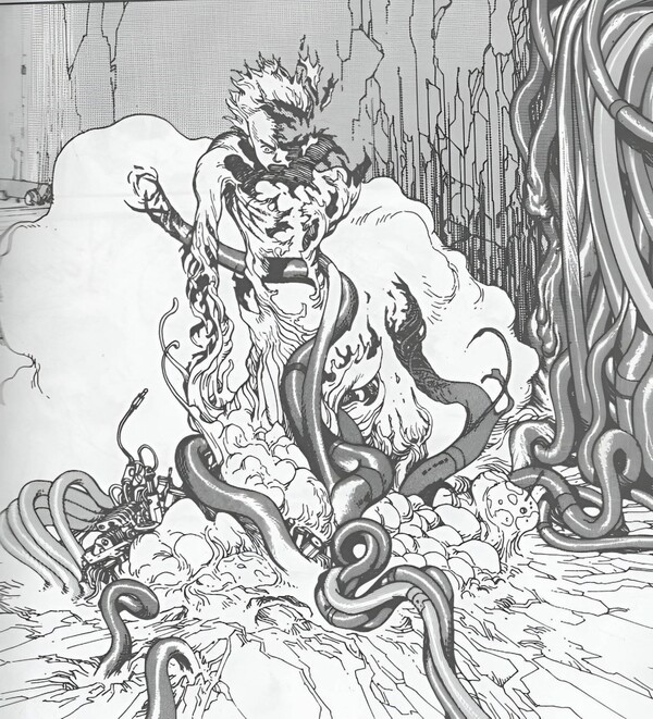 В «Акира» Кацухиро Отомо метаморфоза Тэцуо Шимы приобретает космическое измерение, буквально разрывая границы человеческого тела. Под действием бесконтрольной силы Тэцуо начинает терять форму: его тело разрастается, пугающе деформируется, становится бесформенной массой. Этот процесс не сопровождается героизацией — напротив, он вызывает ужас и сочувствие.