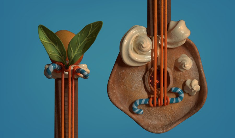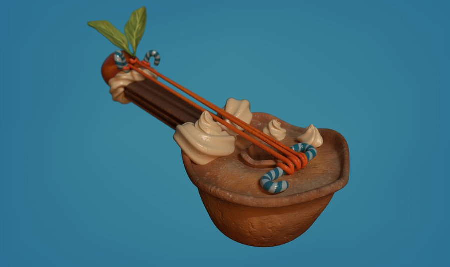 И куда же сладкому мальчику без своего укулеле? Сладкое пирожное с карамельными струнами было смоделено и заретоплено в Maya, текстуры сделаны в Substance Painter