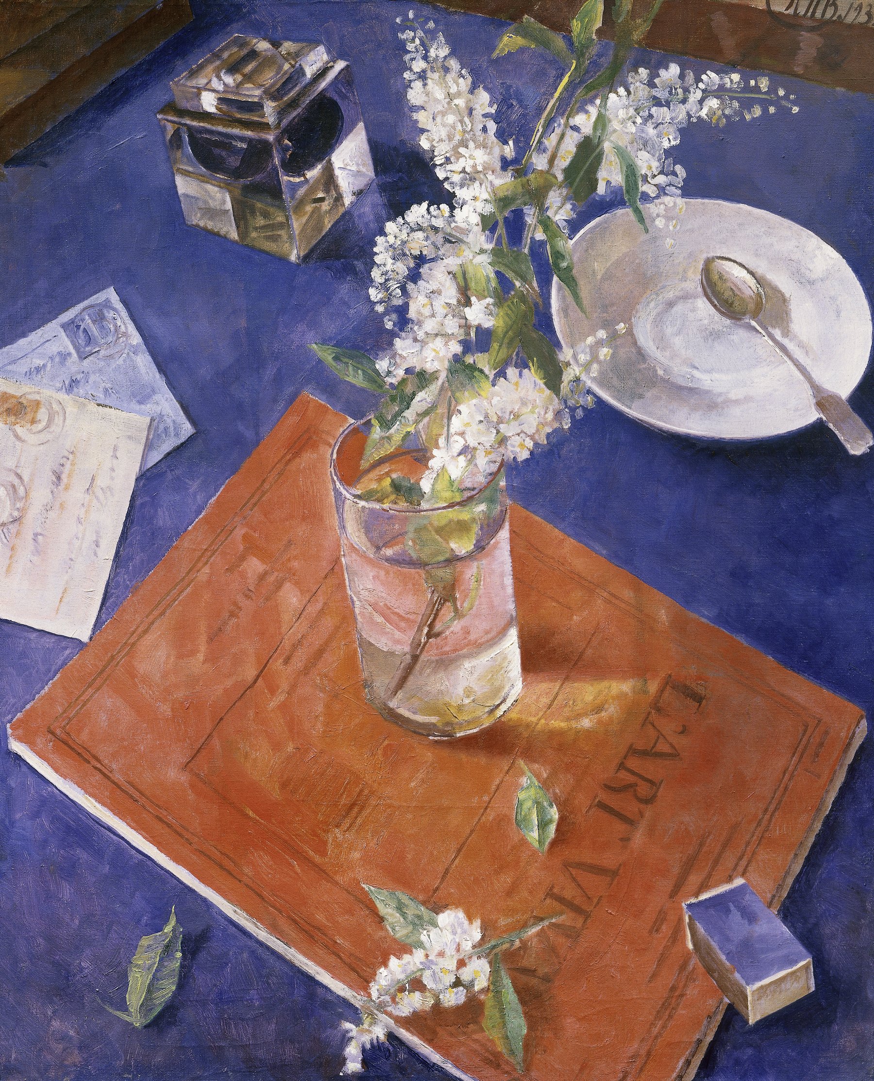 И тем не менее Петров-Водкин не связал себя накрепко с какой-либо группировкой. Он создал собственную теорию так называемой «сферической перспективы» и разработал оригинальный художественный язык, совмещающий стилистические элементы Раннего Возрождения, русской иконописи, символизма и кубизма. Картина «Черёмуха в стакане» (1932) — один из примечательных примеров позднего творчества мастера. На полотне изображена ветка черёмухи в простом стеклянном стакане, стоящем на столе.