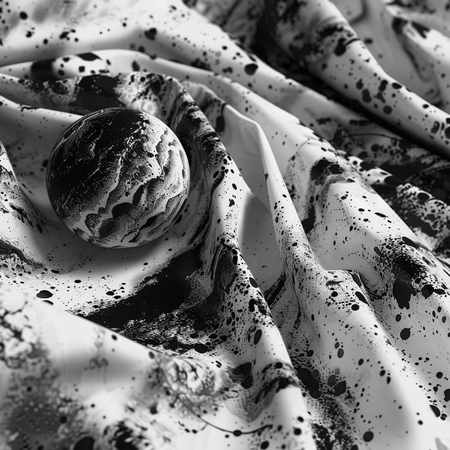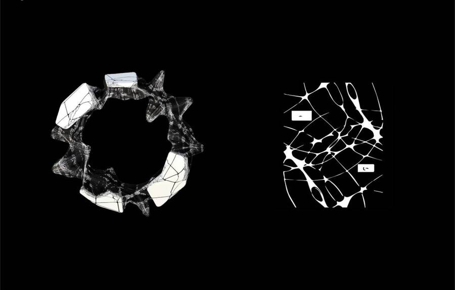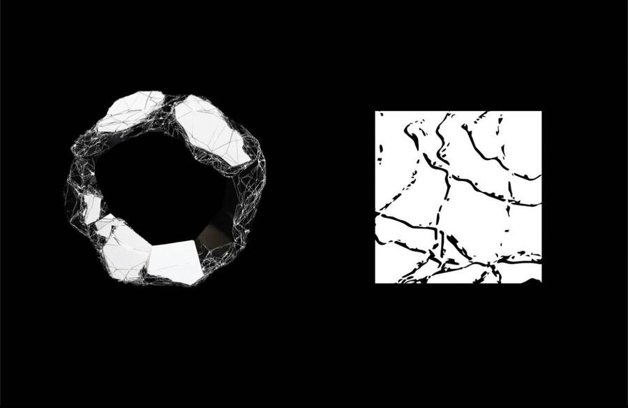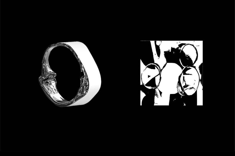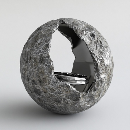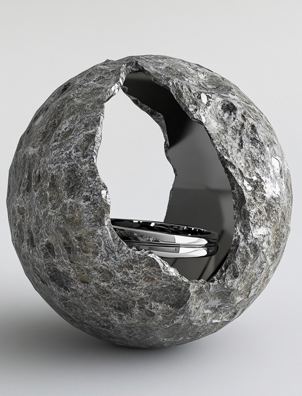 Продукт представляет собой кольца из метеорита в необычных упаковках в форме сферы. Изображения сгенерированы при помощи нейросети midjourney путём введения промтов, подобных данному: a brand of meteorite jewelry. The packaging is designed as a sphere, like a foundation filled with generative art in black-white-gray shades.