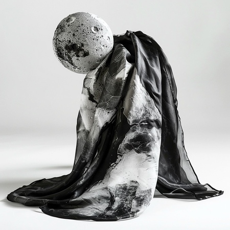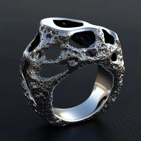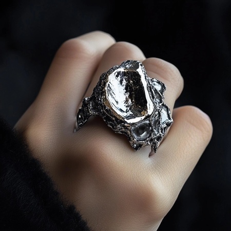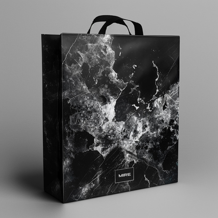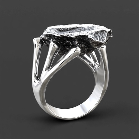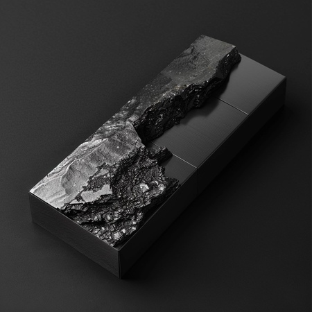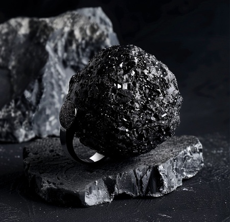 Промт: expensive packaging of meteorite ring, premium package with handles branded macro details of the meteorite in black-white-gray shades and a satin ribbon --ar 3:2 --sref