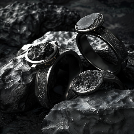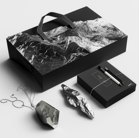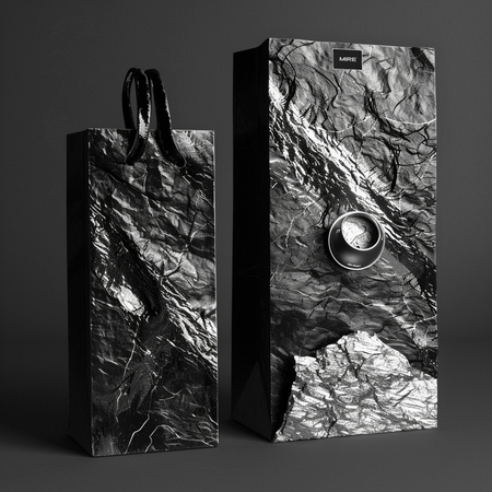 Промт: expensive packaging of meteorite ring, premium giftpack with handles brandedmacro details of the meteorite in black-white-gray shades --ar 3:2 --sref