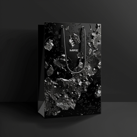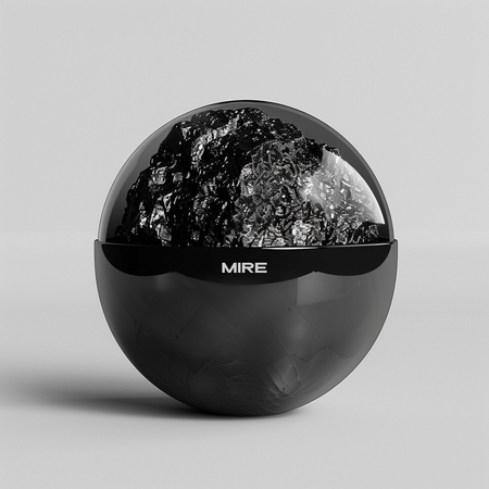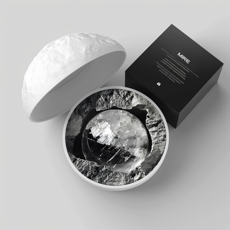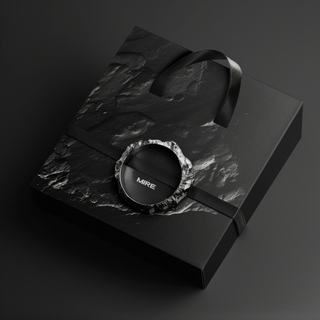 Promt: expensive rectangular packaging of meteorite ring, premium sphere box with branded minimalist logo in black-white shades, with the label «MIRE» --ar 3:2 --sref
