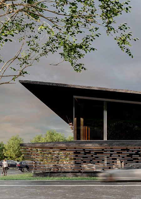 Ресторан представляет собой гармоничное сочетание современной архитектуры и естественной красоты окружающей природы. Основываясь на концепции Кенго Кума, фасад ресторана выполнен с использованием натуральных материалов, таких как дерево и камень, что позволит ему естественным образом вписаться в ландшафт.